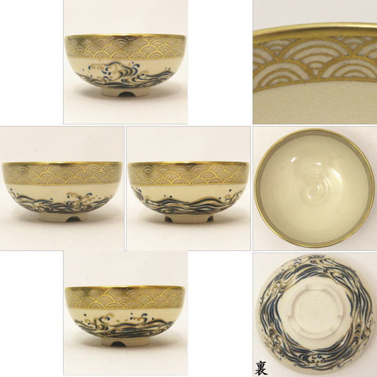 【茶器/茶道具 抹茶茶碗】 色絵茶碗 平茶碗 波 割高台 清閑寺窯