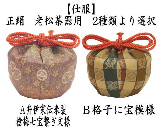 【茶器/茶道具 老松仕服(老松仕覆)】 老松茶器用 井伊家伝来裂 槍梅七宝繋ぎ文様又は格子に宝模様 2種類より選択