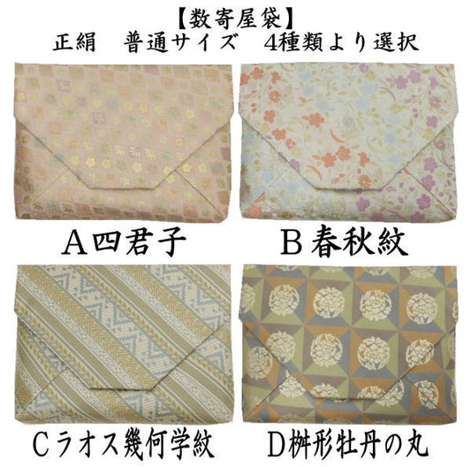 〇【茶器/茶道具 数奇屋袋(数寄屋袋)】 普通サイズ 正絹 四君子又は春秋紋又はラオス幾何学紋又は桝形牡丹の丸