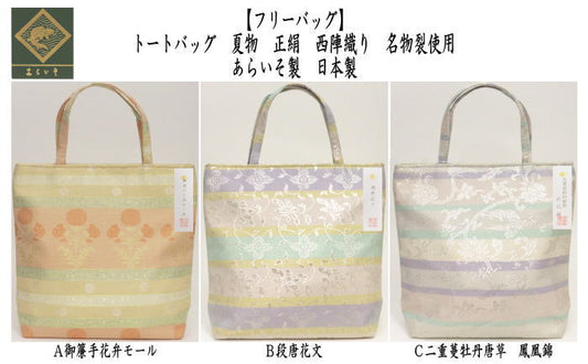 【和装バッグ フリーバッグ】 トートバッグ 夏物 正絹 西陣織り 名物裂使用 御簾手花弁モール又は段唐花文又は二重蔓牡丹唐草 鳳凰錦 荒磯製(あらいそ) 紗織り生地使用