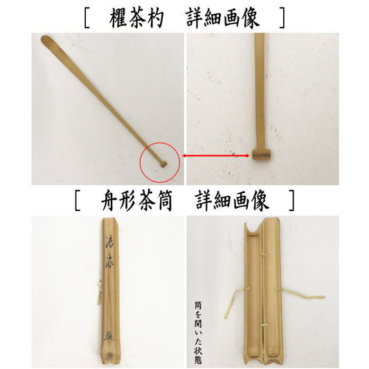 【茶器/茶道具 銘付茶杓】 櫂茶杓 真竹 銘「清流」 舟形茶筒入 法谷文雅筆 宮下竹憲作