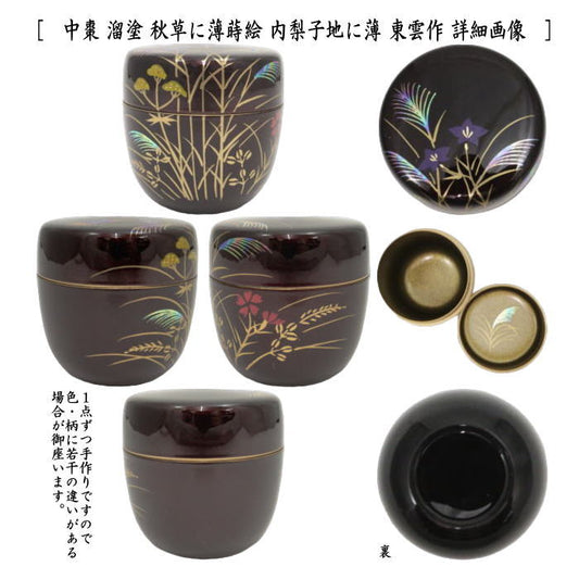 〇【茶器/茶道具 なつめ(お薄器)】 中棗 溜塗り 秋草に薄蒔絵 内梨子地に薄(内梨地に薄)又は菊に流水蒔絵 梨子地に菊流水(梨地に菊流水) 東雲作 2種類より選択
