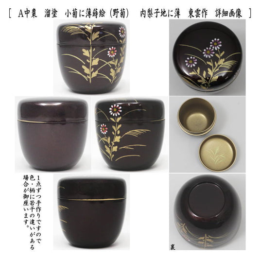 〇【茶器/茶道具 なつめ(お薄器)】 中棗 溜塗り 小菊に薄蒔絵(野菊) 内梨子地に薄(内梨地に薄)又は小菊蒔絵 内梨子地に萩(内梨地に萩) 東雲作 2種類より選択