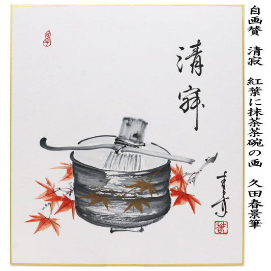〇【茶器/茶道具 色紙画賛】 自画賛 清寂 紅葉に抹茶茶碗の画 久田春景筆