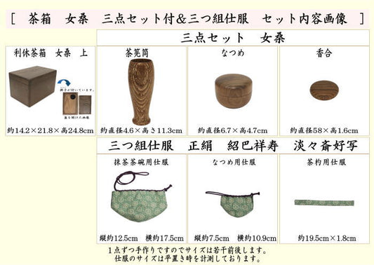 【茶器/茶道具 茶箱道具】 茶箱 女桑 三点セット付(茶筅筒・なつめ・香合)&三つ組仕服 祥寿緞子 淡々斎好写し(茶碗・なつめ・茶杓)セット