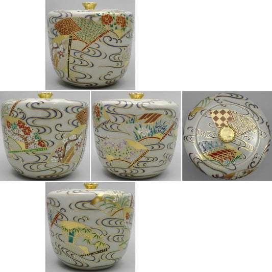 【茶器/茶道具 皆具】 色絵 膳所焼き 扇面流し 岩崎新定作(陽炎園)