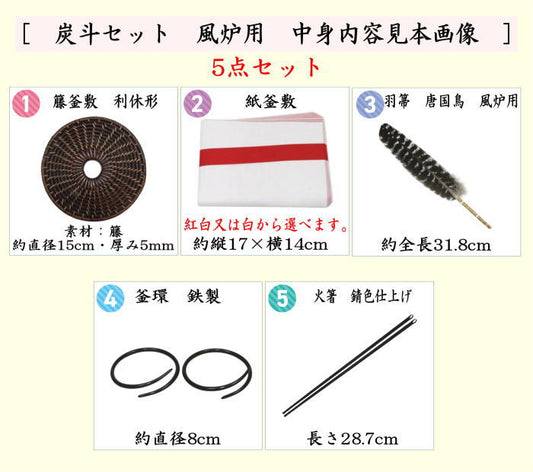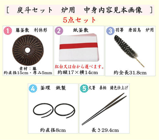 【茶器/茶道具 茶道具セット 炭道具】 炭斗セット 炉用 中身 5点セット 紙釜敷 紅白又は白が選べる