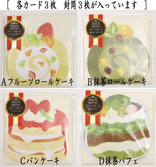 【日用品 メッセージカード】 スイーツカード (カード3枚・封筒3枚) フルーツケーキ&抹茶ロールケーキ&パンケーキ&抹茶パフェ