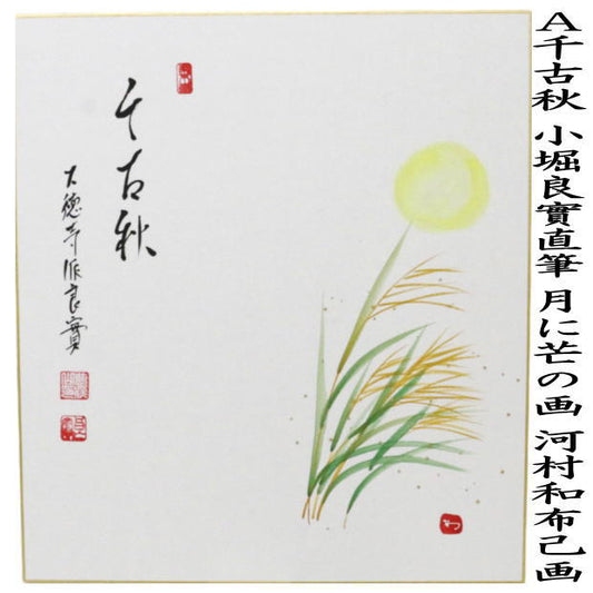 〇【茶器/茶道具 色紙画賛】 直筆 千古秋 月に芒の画又は古寺鐘 柿の画 小堀良實筆 河村和布己画 2種類より選択