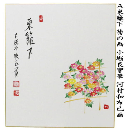 【茶器/茶道具 色紙画賛 重陽の節句】 直筆 東籬下 菊の画 小堀良實筆 河村和布己画又は円香画