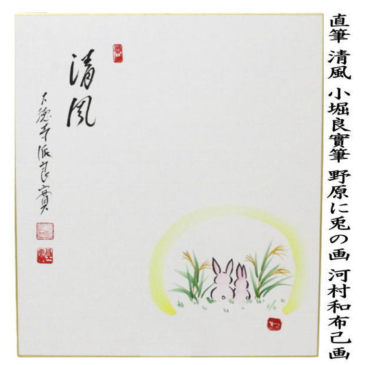 【茶器/茶道具 色紙画賛】 直筆 清風 小堀良實筆 野原に兎の画 河村和布己画