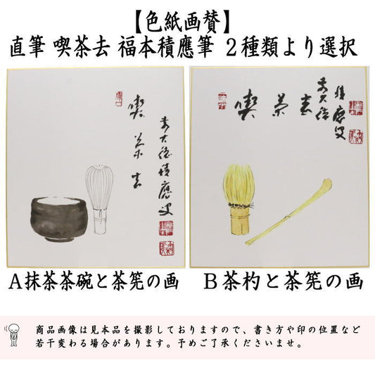 【茶器/茶道具 色紙画賛】 直筆 喫茶去 福本積應筆 抹茶茶碗と茶筅の画又は茶杓と茶筅の画