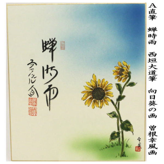 【茶器/茶道具 色紙画賛】 直筆 蝉時雨 向日葵の画又は涼風 子供と西瓜の画 西垣大道筆 曽根幸風画