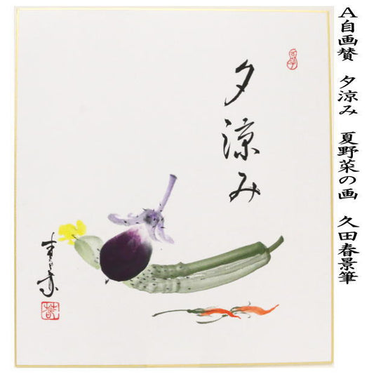 【茶器/茶道具 色紙画賛】 自画賛 夕涼み 夏野菜の画又は盛夏 向日葵の画 久田春景筆