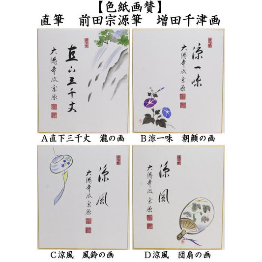 〇【茶器/茶道具 色紙画賛】 直筆 直下三千丈 瀧の画又は涼一味 朝顔の画又は涼風 風鈴の画又は涼風 団扇の画 前田宗源筆 増田千津画