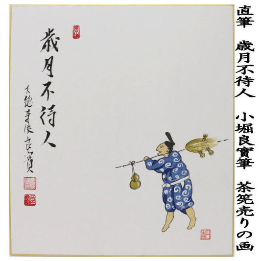 〇【茶器/茶道具 色紙画賛】 直筆 歳月不待人 小堀良實筆 茶筅売りの画