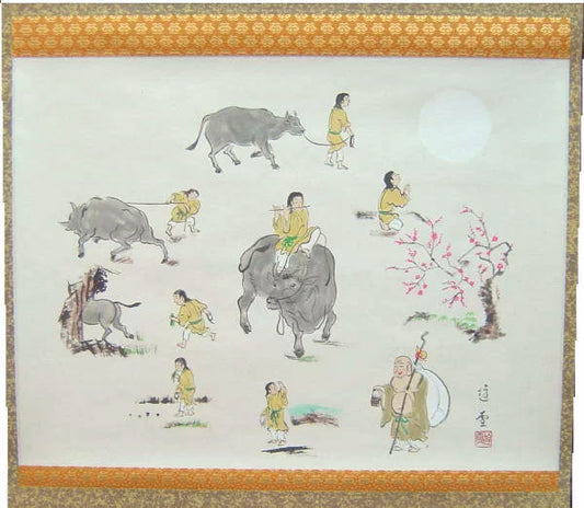 【茶器/茶道具 掛軸(掛け軸) 干支「丑」】 干支掛軸 横軸画賛 大津絵 十牛の図 小森遊雪画 (干支牛 御題実)