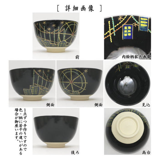 ☆☆〇【茶器/茶道具 抹茶茶碗 御題「明」】 御題茶碗 黒仁清写し イルミネーション 加藤郷山作 (干支午 御題明) (干支 午・馬・うま)