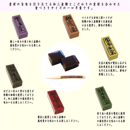 【お菓子/和菓子 羊羹(ようかん)】 1口羊羹 和三盆糖入り (和三宝・和三みつ・抹茶・栗・生姜・珈琲) 6個入り ばいこう堂