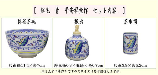 【茶器/茶道具 茶箱用三点セット】 陶器三点セット(陶器三つ揃) 紅毛 青(オランダ) 2代 平安祥堂作(手塚祥堂作) (抹茶茶碗・振出・茶巾筒) (茶箱用3点セット・陶器3点セット・陶器3つ揃・手塚博子)