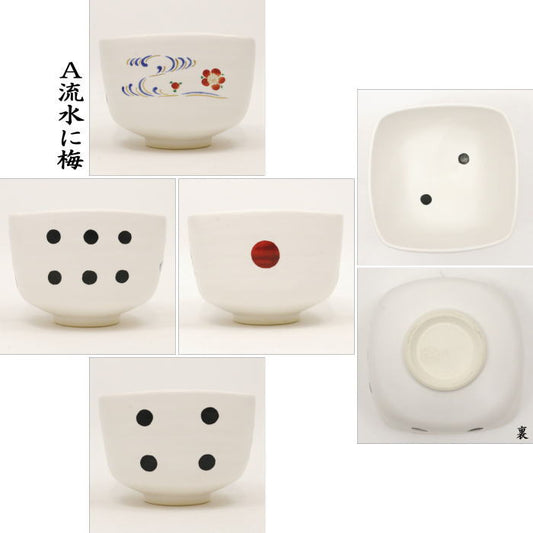 [Tea utensils/tea ceremony tools Matcha tea bowl] Four sides, white glaze, flowing water, plum or chrysanthemum, made by Nakamura Seisai
