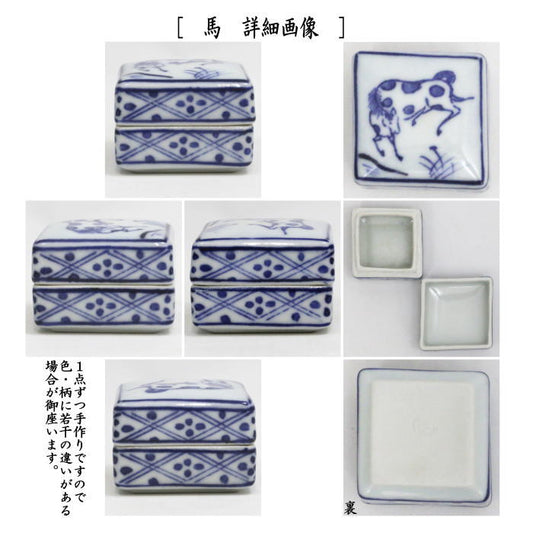 [Tea utensils/tea ceremony tools incense container, zodiac sign "horse"] Zodiac incense container, blue and white, made by Waho, horse or diamond horse