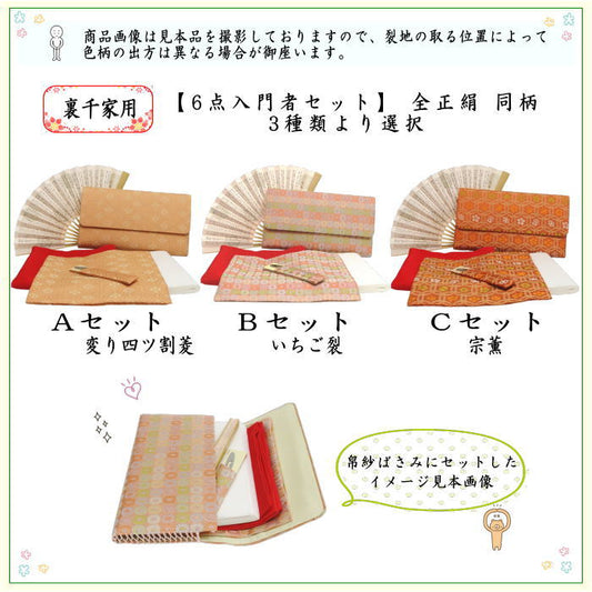 [Tea utensils/tea ceremony utensil set for tea ceremony beginners] 6-piece Urasenke beginner's set, same pattern set, Soka or Ichigo-re (all pure silk, for Urasenke)