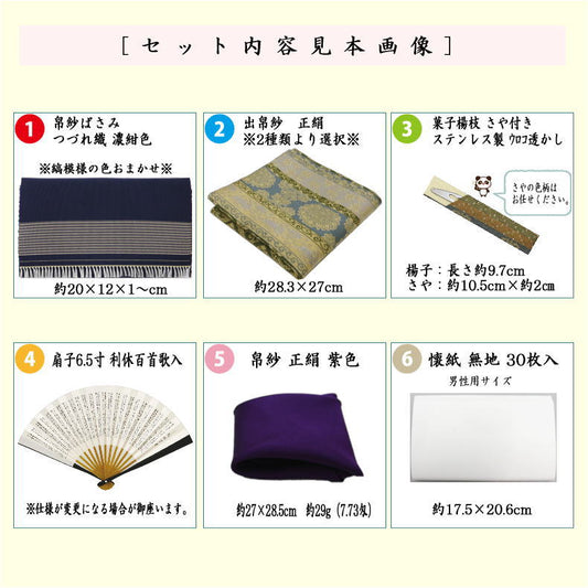 [Tea utensils/tea ceremony utensil set, beginner's set for men/boys] 6-piece Tsuzure set for men who are new to Omotesenke (silk cloth, folding fan for Omotesenke use, 6.5-inch cloth, made from Tatsumura Art Textiles)