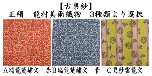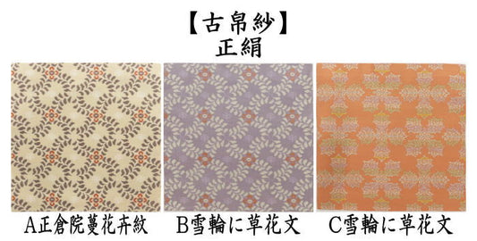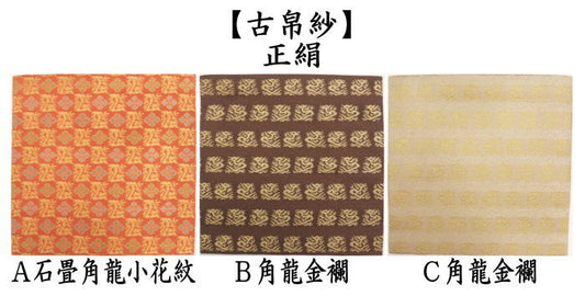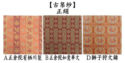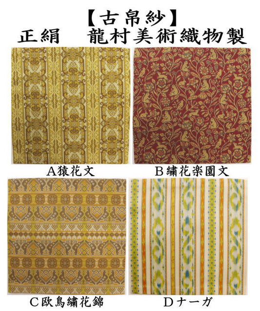【茶器/茶道具 古帛紗】 正絹 龍村美術織物裂使用 鴛鴦唐草文錦又はロワール飾花文又は円文白虎朱雀錦又は天平段文又は天平双華文錦又は花文暈繝錦又はA天平木画奏花錦又はB天平木画奏花錦又は山羊花卉文錦又はA花鳥梅花文錦又はB花鳥梅花文錦又は天平狩猟文錦