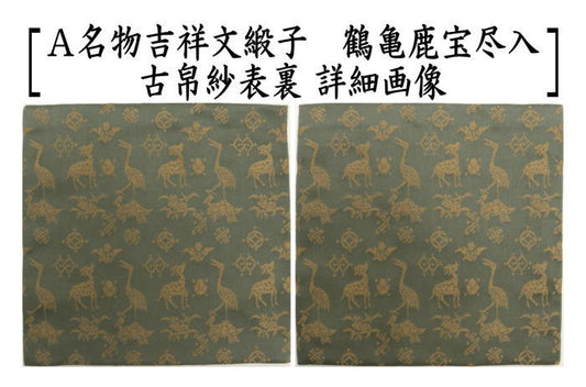 [Tea utensils/tea ceremony tools, old cloth] Pure silk, famous auspicious motif satin, crane, turtle, deer, and treasures, made by Kitamura Tokusai (made by Kitamura Tokusai) (434) (old cloth, old fukusa, old bag, old kobukusa)