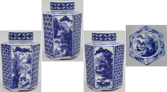 [Sencha tea ceremony utensils, tea caddy] Kyoyaki, blue and white, landscape, hexagonal, by Shoami Takano