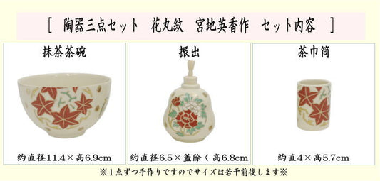 ◎ [Tea utensils/tea ceremony tools 3-piece set for tea box] Ceramic 3-piece set (3 pieces of ceramics) Hanamarumon by Eiko Miyaji (matcha tea bowl, tea shaker, tea towel case) (3-piece set for tea box, 3-piece ceramic set)