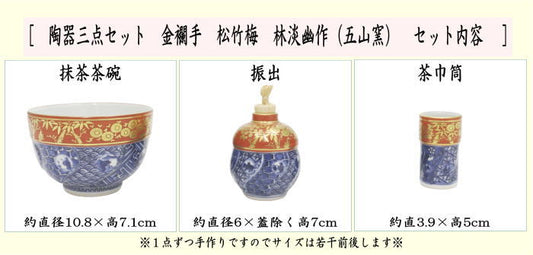[Tea utensils/tea ceremony tools, three-piece set for tea box] Three-piece ceramic set (three ceramic pieces) Kinrande Shochikubai by Hayashi Tanyu (Gozan Kiln) (matcha tea bowl, tea shaker, tea towel holder)