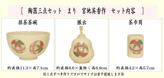 〇 [Tea utensils/tea ceremony tools 3-piece set for tea box] Ceramic 3-piece set (3 pieces of ceramics) Kusudama (Kusudama) by Eiko Miyaji (Matcha tea bowl, tea shaker, tea towel case) (3-piece set for tea box)