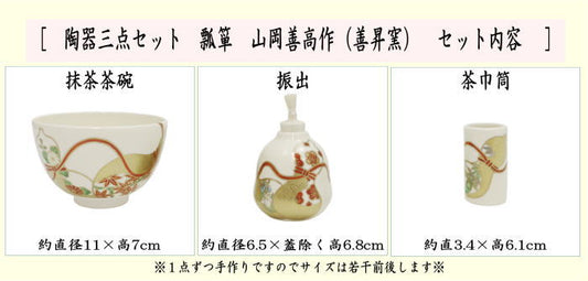 [Tea utensils/tea ceremony tools, three-piece set for tea box] Ceramic three-piece set (three ceramic pieces) Gourd by Yamaoka Yoshitaka (Zenshou Kiln) (matcha tea bowl, tea shaker, tea towel case)
