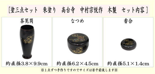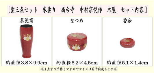 [Tea utensils/tea ceremony tools, three-piece set for tea boxes] Lacquer three-piece set, vermilion-lacquered Kodaiji (tea whisk tube, tea caddy, incense holder), made by Nakamura Muneyoshi, wooden three-piece set for tea boxes
