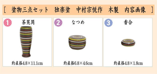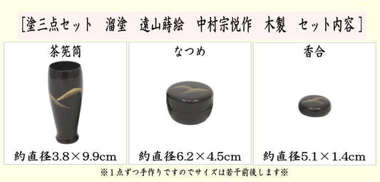 [Tea utensils/tea ceremony tools, three-piece set for tea boxes] Lacquer three-piece set, lacquer, Shippo (tea whisk tube, tea caddy, incense holder), made by Nakamura Muneyoshi, wooden three-piece set for tea boxes
