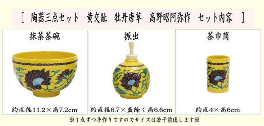 [Tea utensils/tea ceremony tools, three-piece set for tea box] Three-piece ceramic set (three ceramic pieces) Yellow Kochi, peony arabesque, by Shoami Takano (matcha tea bowl, tea shaker, tea towel case)