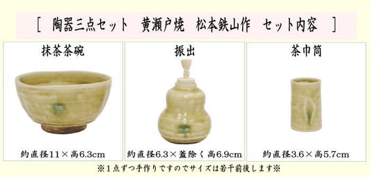 〇 [Tea utensils/tea ceremony tools, three-piece set for tea box] Three-piece ceramic set (three ceramic pieces) Kiseto ware, Matsumoto Tetsuzan (matcha tea bowl, tea cup, tea towel holder)