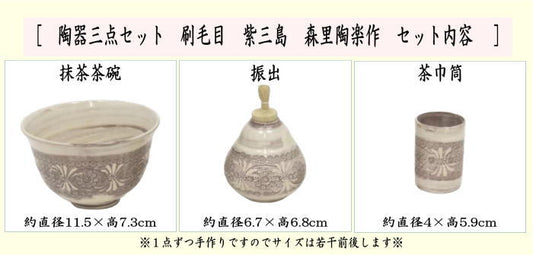 [Tea utensils/tea ceremony tools 3-piece set for tea box] Ceramic 3-piece set (3 pieces of ceramics) Brushed Murasaki Mishima by Morizato Toraku (matcha tea bowl, teacup, tea towel holder) (3-piece set for tea box, 3-piece ceramic set)