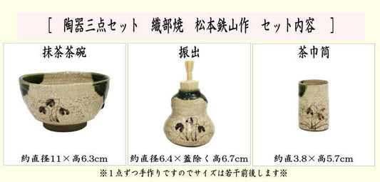 〇 [Tea utensils/tea ceremony tools 3-piece set for tea box] Ceramic 3-piece set (3 pieces of ceramics) Oribe ware by Matsumoto Tetsuzan (matcha tea bowl, tea shaker, tea towel tube) (Seto ware, 3-piece set for tea box, ceramic 3-piece set)