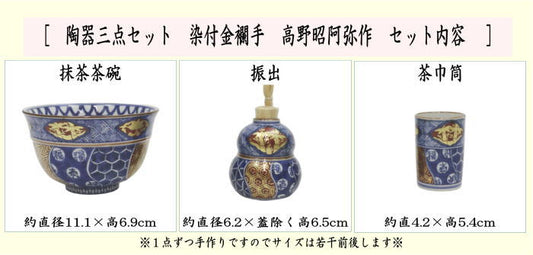 [Tea utensils/tea ceremony tools 3-piece set for tea box] Ceramic 3-piece set (3 pieces of ceramics) Blue and white brocade by Shoami Takano (matcha tea bowl, teacup, tea towel case) (3-piece set for tea box, 3-piece ceramic set)
