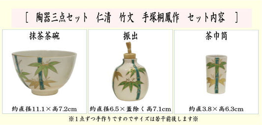 [Tea utensils/tea ceremony tools 3-piece set for tea box] Ceramic 3-piece set (3 pieces of ceramics) Ninsei copy Bamboo pattern Tezuka Toho (Heian Toho) (Matcha tea bowl, tea shaker, tea towel holder) (3-piece set for tea box, ceramic 3-piece set)