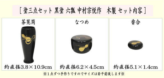 [Tea utensils/tea ceremony tools, three-piece set for tea boxes] Lacquer three-piece set, black lacquer, Rokuhyō (tea whisk tube, tea caddy, incense holder), made by Muneyoshi Nakamura, wooden three-piece set for tea boxes