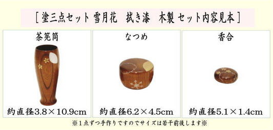 [Tea utensils/tea ceremony tools, three-piece set for tea boxes] Lacquer three-piece set, Setsugekka, wiped lacquer (natsume, incense box, tea whisk case), wooden three-piece set for tea boxes