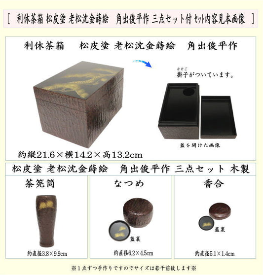 [Tea utensils/tea ceremony tools, tea box] Rikyu tea box, pine bark coating, old pine, gold and silver lacquer, made by Shunpei Kakude, includes three-piece set