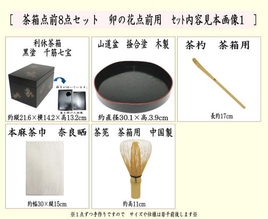 [Tea utensils/tea ceremony set, tea box set] Tea box 8-piece set, Unohana tea ceremony (Rikyu tea box, Sanmichi tray, ceramic 3-piece set, lacquer 3-piece set, three-piece set of kimono, tea whisk, tea towel, tea scoop)