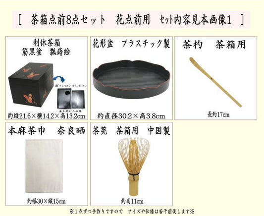 [Tea utensils/tea ceremony tools, tea box set, flower tea ceremony] 8-piece tea box set (sujigyou maki-e tea box, flower-shaped tray, ceramic three-piece set, lacquer three-piece set, three-piece set of ceramist, tea whisk, tea towel, tea scoop)