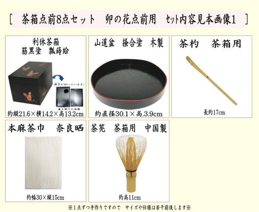 [Tea utensils/tea ceremony set, tea box set] 8-piece tea box set for Unohana tea ceremony (Rikyu tea box, Sanmichi tray, ceramic three-piece set, lacquer three-piece set, three-piece set of ceremonial clothes, tea whisk, tea towel, tea scoop)