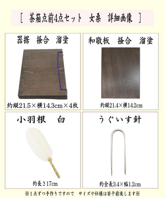 [Tea utensils/tea ceremony tools, tea box, tea ceremony tools] Tea box, tea ceremony 4-piece set, female mulberry (table, female mulberry, Wakei board, female mulberry, small feather, white, greenish-brown needle)